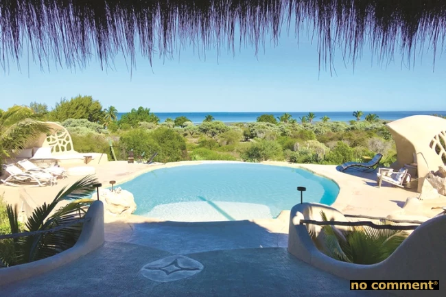 Le lodge s'étend sur ce qui fut autrefois un sol ingrat — sable, cailloux, vent du sud. Aujourd'hui, c'est une petite forêt. Arbres fruitiers, herbes aromatiques, fleurs tropicales : la permaculture est au cœur de la philosophie de la maison, avec compost, paillage, culture bio et respect du calendrier lunaire. « Nous avons appris sur le terrain, en expérimentant, et aujourd'hui nous avons un écosystème fertile et vivant, même au cœur du climat sec du sud de Madagascar », précise Patricia. On ne sait pas si c'est de l'entêtement ou de la foi. Probablement les deux. Les chambres et suites — toutes différentes, insiste-t-on — mêlent influences locales et design européen, bois, pierres volcaniques et textures naturelles. La grande suite familiale peut accueillir jusqu'à six personnes, ce qui la rend particulièrement adaptée aux familles ou groupes d'amis cherchant à s'éloigner de l'agitation des grandes stations touristiques. Les tarifs varient selon la chambre et la période, généralement entre 130 et 230 euros — des conditions différentes selon qu'on réserve en direct, via plateforme ou tour-opérateur.